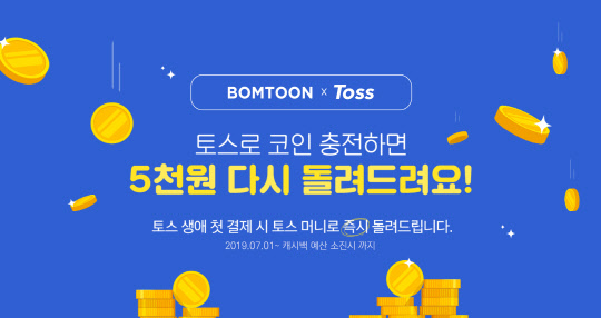 본 프로모션은 봄툰 회원이 토스 신규 가입 후 48시간 이내 봄툰에서 1만원 이상 결제 시토스 머니 5,000원을 캐시백해주는 형태이며 기존에 봄툰에서 결제를 했던 회원이라도 토스를 이용해보지 못한 첫 고객이라면 동일한 혜택이 제공된다.