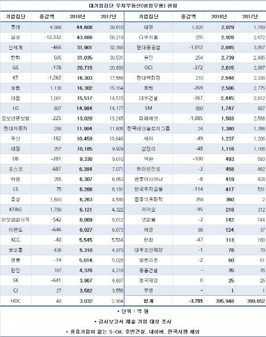 그룹별로는 롯데가 전년보다 12.6%(4999억원) 증가한 4조4608억원으로 가장 많았다. 새로 취득한 부동산은 702억원에 그쳤지만 업무용에서 비업무용으로 대체된 부동산이 4000억원을 훌쩍 넘었다.
