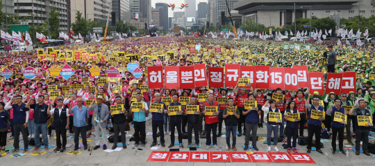 3일 오후 서울 광화문광장에서 열린 '공공부문 비정규노동자 총파업 비정규직 철폐 전국노동자대회'에서 참가자들이 비정규직 철폐, 차별 해소, 처우개선 등을 촉구하며 구호를 외치고 있다.