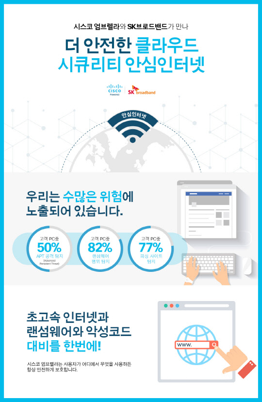 SKB의 클라우드 시큐리티 플랫폼과 시스코의 기술력이 합쳐진 단일 플랫폼을 통해 웹 상의 다양한 공격을 예방·대응할 수 있다. 이번에 출시된 클라우드 시큐리티 서비스인 안심인터넷은 인터넷 게이트웨이 보안 솔루션인 시스코 엄브렐라를 통해 별도의 에이전트 설치 없이도 APT, 랜섬웨어·멀웨어, 피싱 등 유해서비스 및 바이러스 차단까지 광범위한 기능을 제공한다. 특히 SKB의 클라우드 시큐리티 플랫폼을 통해 수분 내 전사적 범위에 구축이 가능해 설치가 용이하다.