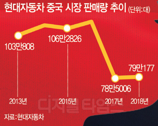 하지만 2017년부터 상황이 급변하기 시작했다. 2016년까지 4년 연속으로 연간 100만대를 기록했던 중국 시장은 2017년 전년보다 31.3% 급감했다. 이어 작년 0.6% 증가한 79만177대를 기록하며 누적 판매 1000만대를 돌파했다. 그해 연말인 12월 8만7821대를 팔며 1004만6535대로 겨우 턱걸이했다. 애초 상반기 달성을 목표로 했던 만큼 계획보다 늦어진 '반쪽짜리' 기록이었다.