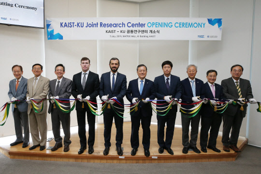 지난 5일 대전 KAIST 본원 KI빌딩에서 열린 'KAIST-KU 공동연구센터' 개소식에서 신성철 KAIST 총장(왼쪽 여섯번째), 아리프 술탄 알 하마디 KU 총장대행(다섯번째) 등 양교 주요인사들이 테이프 커팅을 하고 있다.