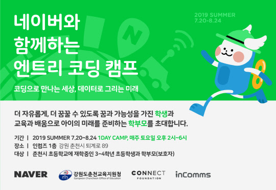네이버는 오는 20일부터 춘천에서 '네이버와 함께하는 엔트리 코딩캠프'를 시작한다. 춘천교육지원청과 함께 진행하는 이 교육 프로그램은 다음달 24일까지 매주 토요일마다 운영되며, 지역 초등학생과 학부모의 신청을 받아 네이버 자회사 인컴즈에서 진행된다.