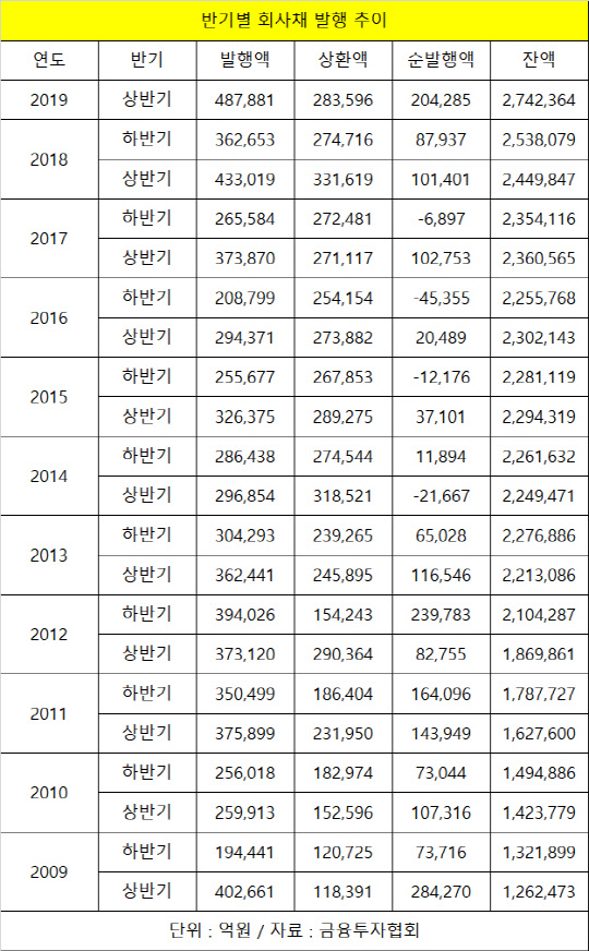 올해와 지난해 상반기를 제외하고 회사채 발행액이 40조원을 넘은 반기도 글로벌 금융위기 직후인 2009년 상반기(40조3000억원)뿐이다.