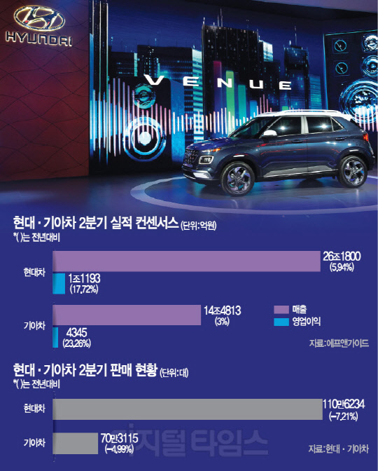 현대·기아차는 올해 2분기 세계 시장에서 판매량이 뒷걸음질했다. 현대차는 작년 같은 기간보다 7.21% 줄어든 110만6234대, 기아차는 4.99% 감소한 70만3115대에 그쳤다. 지속하는 중국 시장 부진의 직격탄을 맞은 탓이다.
