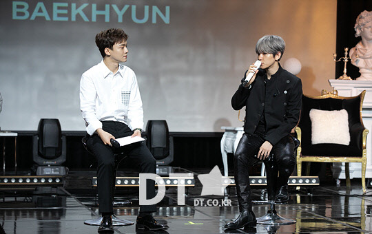 그룹 엑소(EXO)의 백현(오른쪽)과 첸이 10일 서울 강남구 SAC아트홀에서 열린 백현 첫 솔로 앨범 'City Lights(시티 라이츠)' 쇼케이스에서 토크를 하고 있다.