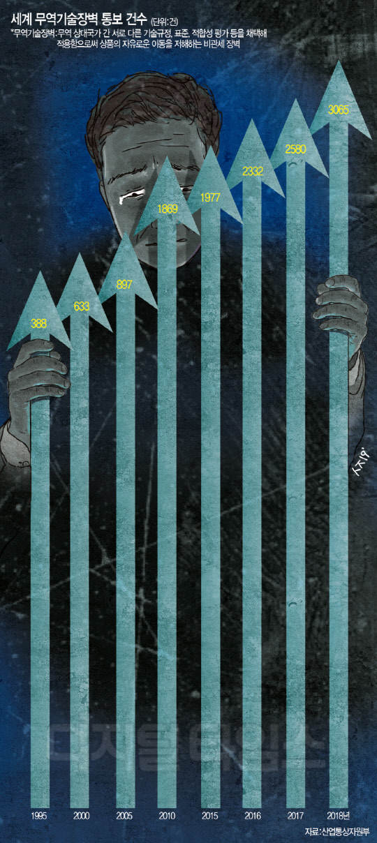 보호무역주의 확산으로 무역기술장벽 통보 건수는 2005년 897건에서 2015년 1977건, 2017년 2580건, 2018년 3065건으로 계속 늘고 있다.