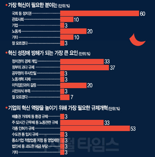설문 조사 결과에 따르면 혁신성장을 방해 요소로는 '정부의 과다 규제(37.0%)'와 '정치권의 경제 개입'(33.0%)가 선두를 차지했다. 다음으로 '이익집단과의 갈등(20.0%)', '공무원의 무사안일(3.0%)', '노동개혁 지체(3.0%)' 등의 순으로 이어졌다.