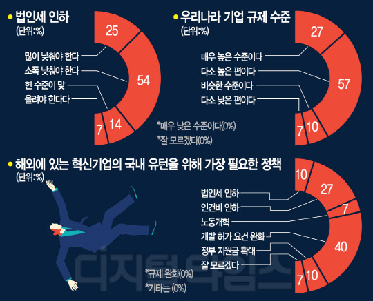 아울러 기업의 혁신 역량을 높이기 위해 가장 필요한 규제개혁으로는 '각종 인허가 규제(53.0%)'가 1위를 기록했다. '주 52시간 근무제 등 노동관련 규제(33.0%)'가 뒤를 이었으며, '수도권 등 입지 규제(3.0%)', '중소기업 적합업종 지정 등 영업제한(3.0%)', '법인세 등 과도한 세금 부담(3.0%)' 등이 같은 수치를 보였다.