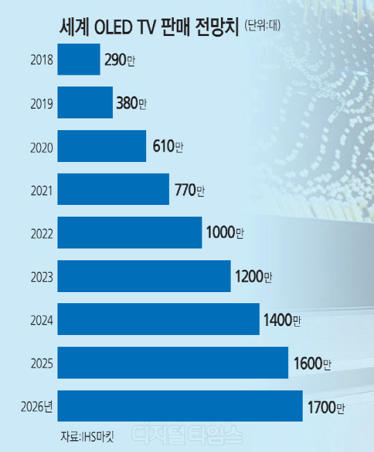 시장조사업체 IHS마킷에 따르면 대형 OLED 패널 판매량은 지난해 290만대에서 올해 380만대, 2021년 770만대, 2022년 1000만대까지 늘어날 전망이다. 이에 따라 전체 TV 시장에서 OLED TV 점유율 역시 작년 5.7%에서 2023년 10.4%까지 커질 것으로 예상된다.