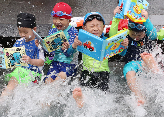 대서인 23일 오전 서울 송파구 성내천을 찾은 어린이들이 물놀이와 독서를 동시에 즐기고 있다. 송파구는 성내천 물놀이장에 도서를 비치하고 파라솔과 테이블 등 독서 공간을 제공하는 '여름행복문고'를 일주일간 운영한다고 밝혔다.