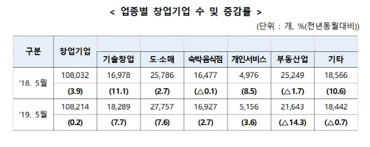 다만 지난해 같은 달과 비교해선 0.2%(182개) 늘었다. 부동산업이 감소했음에도, 기술창업(7.7%)과 도소매업(7.6%)을 중심으로 설립이 늘어난 데 따른 영향으로 분석된다.