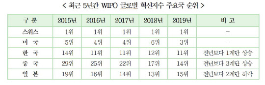 세계지식재산기구(WIPO)가 전 세계 국가들의 혁신역량과 성과를 분석한 '2019년 글로벌 혁신지수' 보고서에 따르면, 우리나라는 총 129개 국가 중에서 11위를 기록했다.