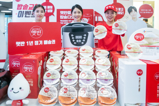 31일 서울 중구 CJ제일제당센터빌딩에서 모델들이 '햇반 밥솥교환 캠페인'을 홍보하고 있다.