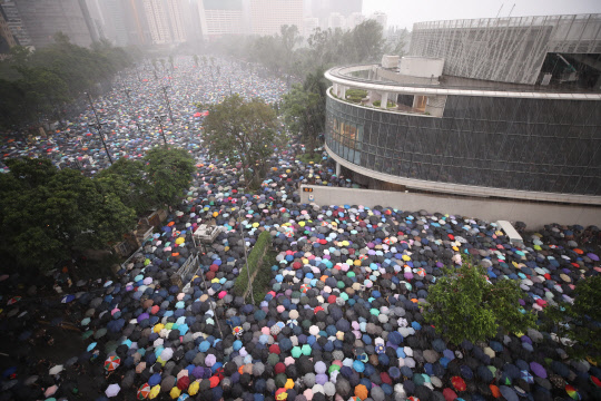 18일 오후(현지시간) 홍콩 빅토리아 공원에서 송환법에 반대하고 경찰의 강경 진압을 규탄하는 대규모 도심 집회가 열리고 있다. 이날 집회는 홍콩 대규모 도심 시위를 주도했던 민간인권전선 주도로 열렸다.