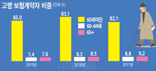18일 보험연구원의 오승연 연구위원과 이규성 연구원이 발표한 '고령 보험계약자의 청구서비스 개선 과제' 보고서에 따르면 전체 보험계약자 중 60세 이상 고령층이 차지하는 비중은 2015년 15%에서 2017년 18%로 늘었다. 특히 65세 이상 보험계약자가 차지하는 비중은 같은 기간 7.6%에서 9.2%로 증가했다.