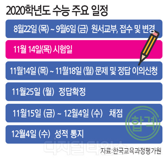 교육부와 한국교육과정평가원은 올해 11월 14일 치러지는 2020학년도 대학 수능 응시원서 접수를 22일부터 시작한다고 20일 밝혔다.