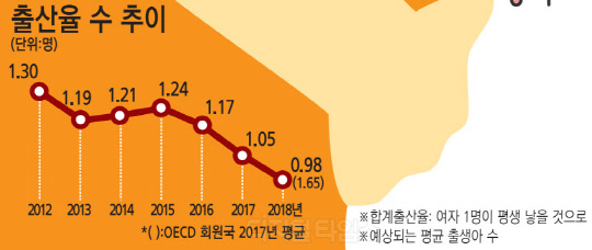 인구 1000명 당 출생아 수는 6.4명으로 전년대비 0.6명 줄었다.합계 출산율은 0.98명이었다. 이로써 우리나라는 국제협력개발기구(OECD) 35개 국가 중 유일하게 출생률 0명대에 진입했다. 합계출산율은 1970년 4.53명에서 77년 2.99명으로 떨어진 뒤 1984년 1.74명으로 점점 감소했다. 이후 34년 만에 0명대를 기록했다. 우리나라가 현 인구 유지를 위해 필요한 합계출산율은 2.1명이다.