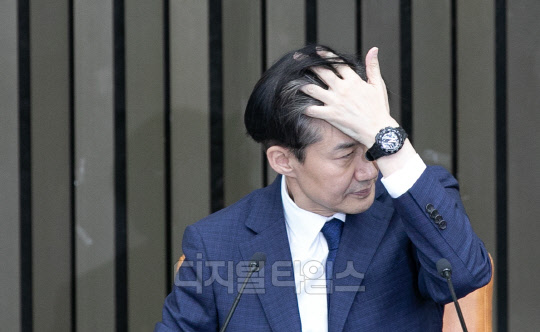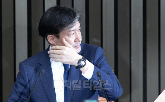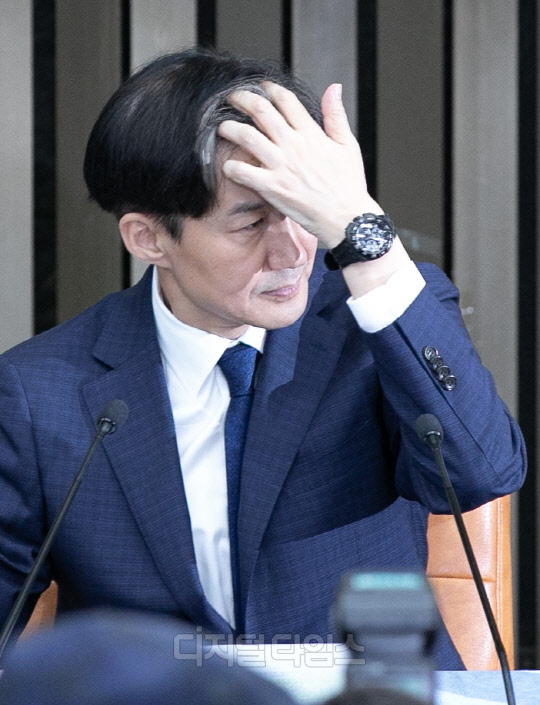 조국 법무부 장관 후보자가 2일 서울 여의도 국회에서 더불어민주당 주재로 열린 기자간담회에 참석해 머리를 넘기고 있다.
