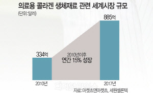 2일 바이오업계에 따르면, 의료용 콜라겐과 관련된 재생의료, 미용·성형 산업분야의 생체재료 관련한 세계시장이 2010년 이후 연간 15%의 지속적인 성장률을 기록하고 있다. 업계 추정으로 이 시장의 규모는 2017년 기준 약 96조원에 달한다.