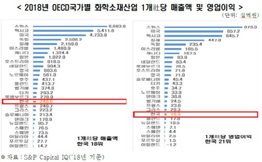 한국 화학소재기업 수는 928개로 OECD 국가 중 2위이고, 3위 일본보다 2.6배, 9위 미국보다 8.6배 많았다. 반면, 기업별 종업원 수는 1025명으로 25개국 중 22위를 기록했다.