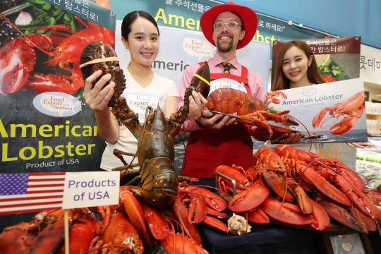 5일 오전 서울 중구 롯데마트 서울역점에서 모델들이 아메리칸 랍스터를 선보이고 있다. 미국 중서부 동북부 식품수출협회는 추석명절을 맞이하여 오늘부터 일주일간 롯데마트 전 점포에서 '아메리칸 랍스터'를 특가 판매한다.