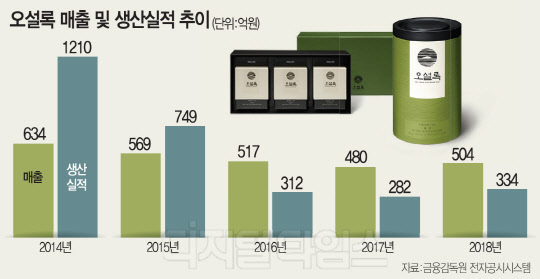 매출이 줄면서 충북 진천에 위치한 녹차 생산 공장인 설록차사업장 생산실적도 급감했다. 오설록 설록차사업장 생산실적은 △2014년 1210억원 △2015년 749억원 △2016년 312억원 △2017년 282억원 △지난해 334억원으로 4년새 4분의 1토막 수준으로 줄었다.