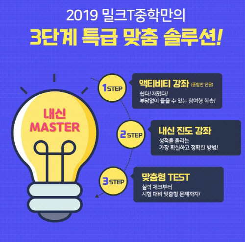 밀크T중학의 2학기 내신진도 강좌는 학습생이 공부를 하는데 흥미를 높여주는 것은 물론 다가오는 중간고사 시험에서 우수한 성적을 받을 수 있도록 우수한 강사진의 고 퀄리티 강의와 효과적인 중학생 공부방법을 알려준다.