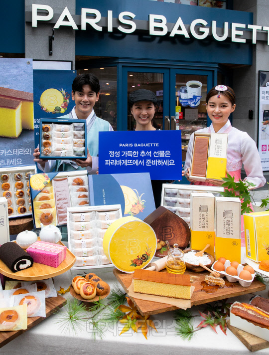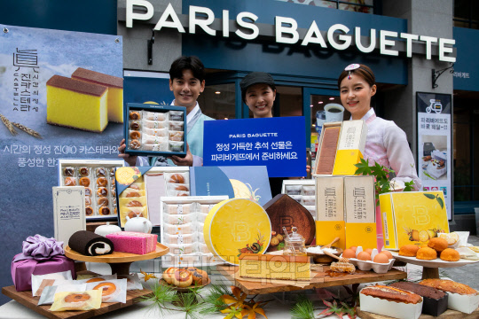 9일 서울 종로구 파리바게뜨 카페대학로점에서 모델들이 '시간의 정성 진(眞) 카스테라' 등 실속형 추석선물세트를 선보이고 있다.