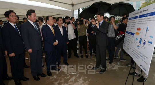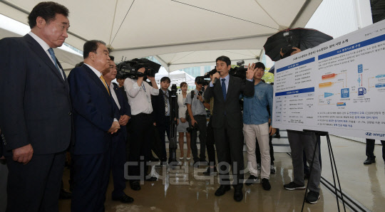 10일 서울 여의도 국회에서 열린 H국회 수소충전소 준공식에서 이낙연 국무총리. 문희상 국회의장 등 주요 내빈이 수소충전소 설비에 대한 설명을 듣고 있다.