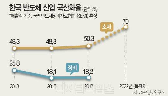 '소재 강국' 일본과의 마찰이 격화하면서 소재부품 분야에서 대일(對日) 의존도가 높은 우리 IT산업에 비상등이 켜졌다. 장기적으로 기술 자립을 이루기 위해 우리 주요 소재부품 산업의 국산화 노력이 가속화 할 것이라는 전망이 나온다.
