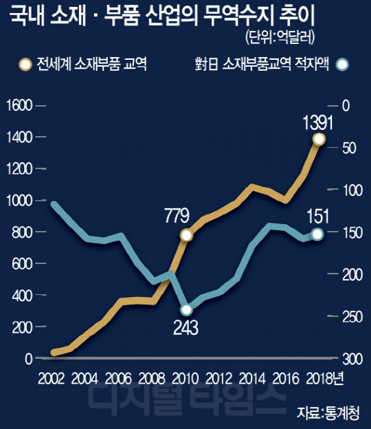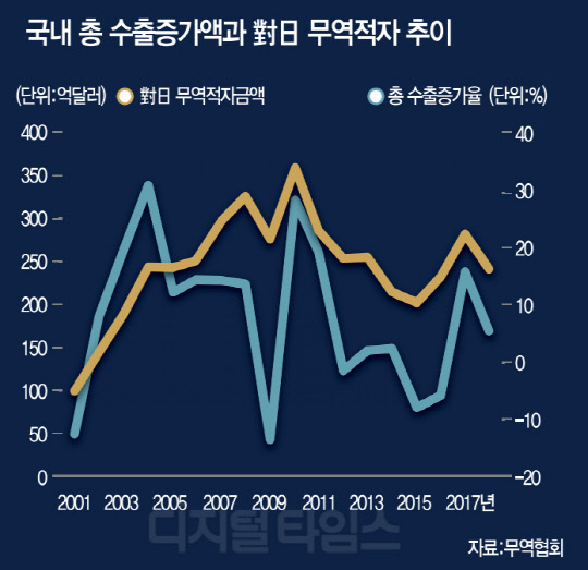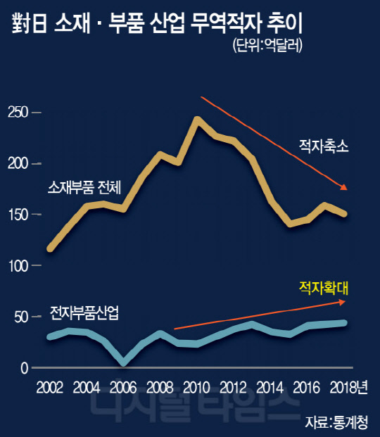 우리금융경영연구소 관계자는 "국내 전자부품 산업의 총 무역흑자 규모가 늘어난 것과 달리 반도체와 디스플레이 관련 중간재의 일본 수입이 증가한 영향으로, 대일 전자산업 무역수지는 2010년 대비 적자가 확대됐다"고 설명했다.