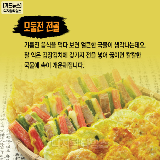 기름진 음식을 먹다 보면 얼큰한 국물이 생각나는데요. 잘 익은 김장김치에 갖가지 전을 넣어 끓이면 칼칼한 국물에 속이 개운해집니다.