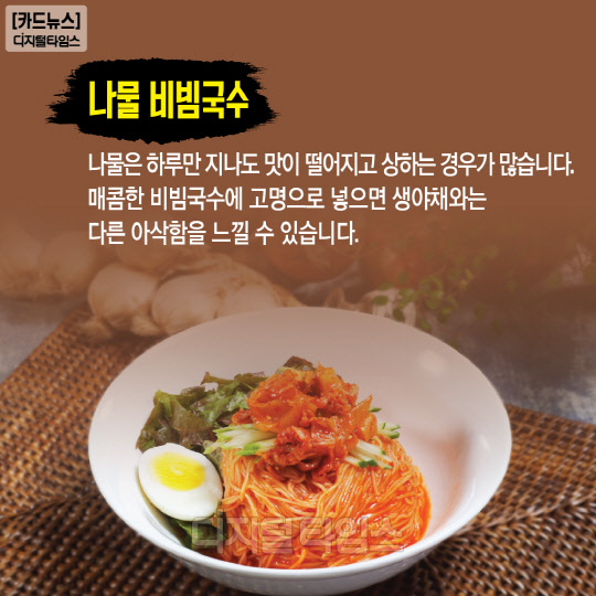 나물은 하루만 지나도 맛이 떨어지고 상하는 경우가 많습니다. 매콤한 비빔국수에 고명으로 넣으면 생야채와는 다른 아삭함을 느낄 수 있습니다.