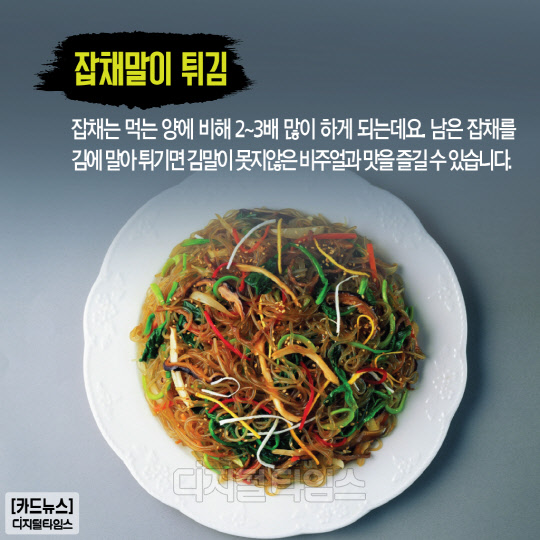 잡채는 먹는 양에 비해 2~3배 많이 하게 되는데요. 남은 잡채를 김에 말아 튀기면 김말이 못지않은 비주얼과 맛을 즐길 수 있습니다.
