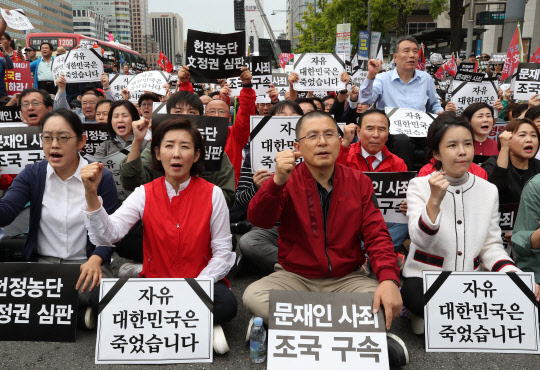 나 원내대표는 "(여권의 주장은) 한국당을 위축시켜 조국 파면을 위축시키려는 것인데 저희가 위축될 사람이냐"며 "(여당은) 급하니까 '민생'하자고 한다. 조국 파면이 민생의 시작"이라고 했다.