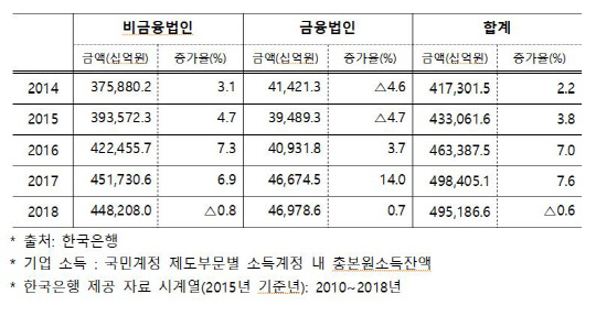 이처럼 기업소득이 전년과 비교해 감소한 것은 2010년 이후 2011년부터 전년대비 증감을 따졌을 때 최근 8년 사이 처음이다. 전년대비 기업소득 증가폭은 2011년 4.6%, 2012년 4.3%, 2013년 2.3%, 2014년 2.2%, 2015년 3.8% 등 등락을 거듭하다 2016년 7.0%, 2017년 7.6%로 확대된 바 있다. 금융법인의 소득은 전년 대비 2013년(-9.3%), 2014년(-4.6%), 2015년(-4.7%) 감소한 적이 있지만, 비금융법인의 소득이 줄어든 것은 이번이 2010년 이후 기준으로는 처음이다.