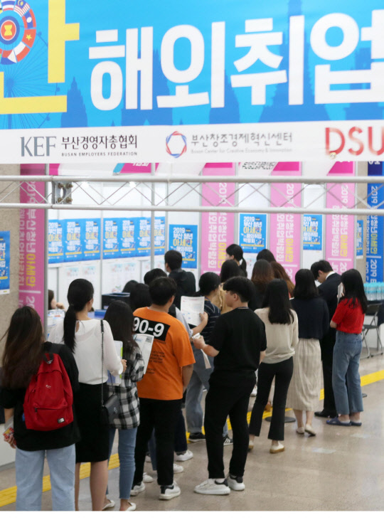 30일 부산시청 로비에서 열린 2019 부산 청년 아세안 해외취업박람회에서 청년들이 줄을 서 참가 신청을 하고 있다.