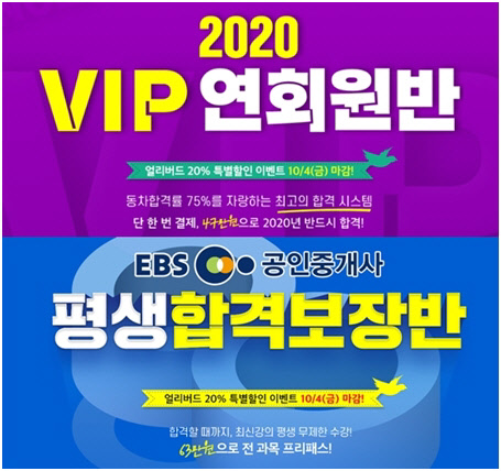 이번 얼리버드 특별 할인 이벤트는 공인중개사 자격증 공부를 돕는 인강 '2020 VIP 연회원반 패키지'와 '평생합격보장반 패키지' 총 2종을 20% 할인된 가격에 제공한다.