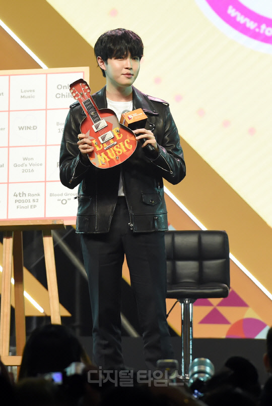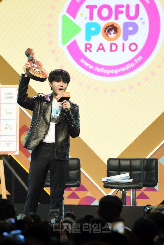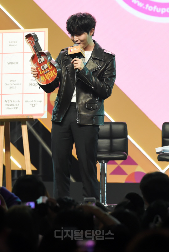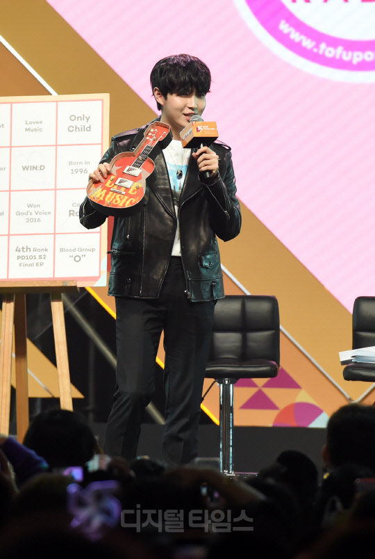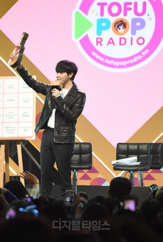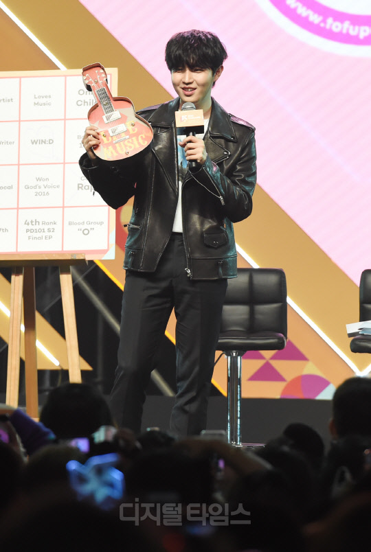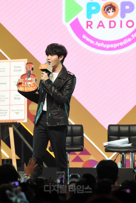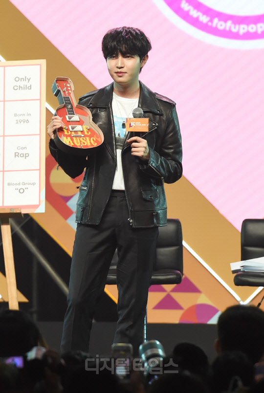 가수 김재환이 28일 태국 방콕 IMPACT ARENA(임팩트 아레나)에서 열린 'KCON 2019 THAILAND(케이콘)' KCON STAGE 무대에서 펼쳐진 Star Live Talk 행사에서 진행을 하고 있다.