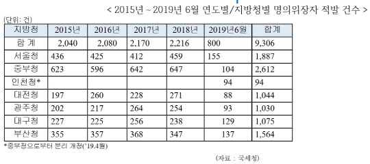 3일 국회 기획재정위원회 김영진 의원(더불어민주당, 수원병)이 국세청으로부터 제출받은 자료에 따르면 명의위장 사업자는 2015년부터 2019년 6월까지 최근 5년간 총 9306건 적발됐다. 2015년에 2040건, 2016년 2080건, 2018년 2170건 등 매년 증가하는 추세다. 올해 6월 기준으로는 800건이 적발됐다.
