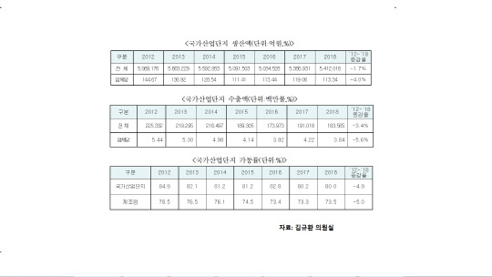 국회 산업통상자원중소벤처기업위원회 소속 김규환 자유한국당 의원이 한국산업단지공단으로 제출받은 자료를 분석한 결과, 2012년 이후 국가산업단지의 생산, 수출, 가동률이 모두 하락세에 있는 것으로 나타났다.