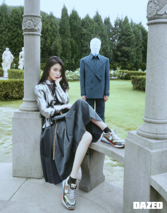 화보 속 아이유는 화이트 컬러의 오버사이즈 칼라가 돋보이는 블랙 재킷과 체크 디테일의 블루-화이트 재킷 및 점프수트, 다양한 소재와 컬러의 믹스가 돋보이는 구찌 울트라페이스 스니커즈와 골드 마리나 체인 디테일의 화이트 실비 1969 백 등을 함께 매치해 감각적인 룩을 연출했다.
