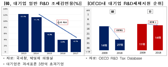 10일 전국경제인연합회 산하 한국경제연구원이 발표한 '한·일 R&D 세제지원 비교' 보고서에 따르면 한국의 경제협력개발기구(OECD) 내 대기업 R&D 세제지원 순위는 2009년 14위에서 지난해 27위로 13단계 하락했다.