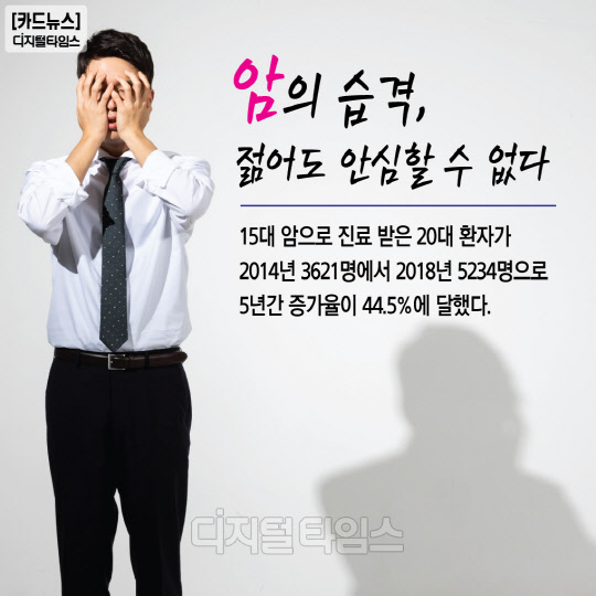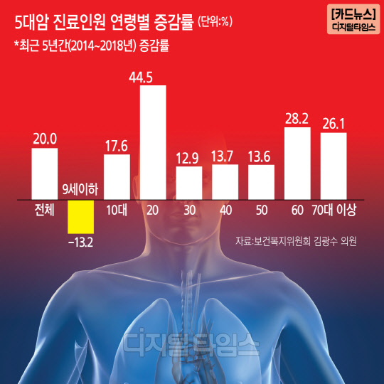 5대 암으로 진료 받은 20대 환자가 2014년 3621명에서 2018년 5234명으로 5년간 증가율이 44.5%에 달했다.