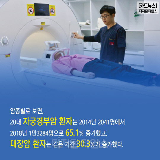 암종별로 보면, 20대 자궁경부암 환자는 2014년 2041명에서 2018년 1만3284명으로 65.1% 증가했고, 대장암 환자는 같은 기간 30.3%가 증가했다.
