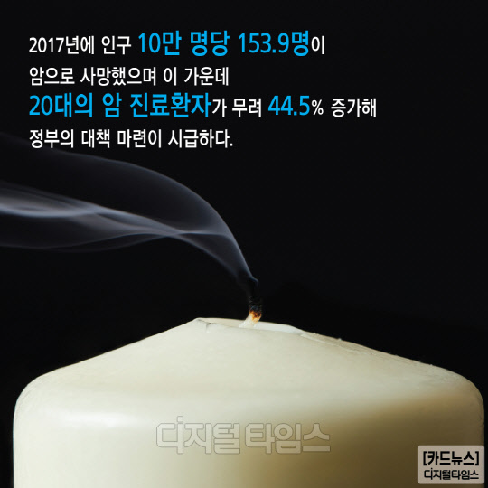 2017년에 인구 10만 명당 153.9명이 암으로 사망했으며 이 가운데 20대의 암 진료환자가 무려 44.5% 증가해 정부의 대책 마련이 시급하다.