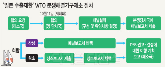 피소국은 양자협의 요청서를 수령한 날로부터 10일 이내 회신해야 하는데, 일본은 9일 만인 지난달 20일 양자협의를 수락했다. 양자협의 수락은 WTO 피소에 따른 일상적 절차로 일본이 과거 WTO에 피소됐을 때 양자협의에 불응한 적은 한 번도 없었다.