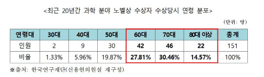 노벨상 수상자 연령대가 높아지는 것은 장기연구에 매진할 수 있는 환경이 수월성이 높은 연구성과의 밑거름이 된다는 것을 의미하는 결과라고 신 의원은 설명했다.