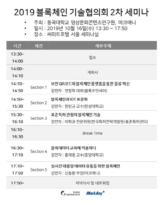 동국대학교 영상문화콘텐츠연구원과 마크애니가 오는 16일 써미트호텔 서울 세미나실에서 '2019 블록체인 기술협의회 2차 세미나'를 개최한다.